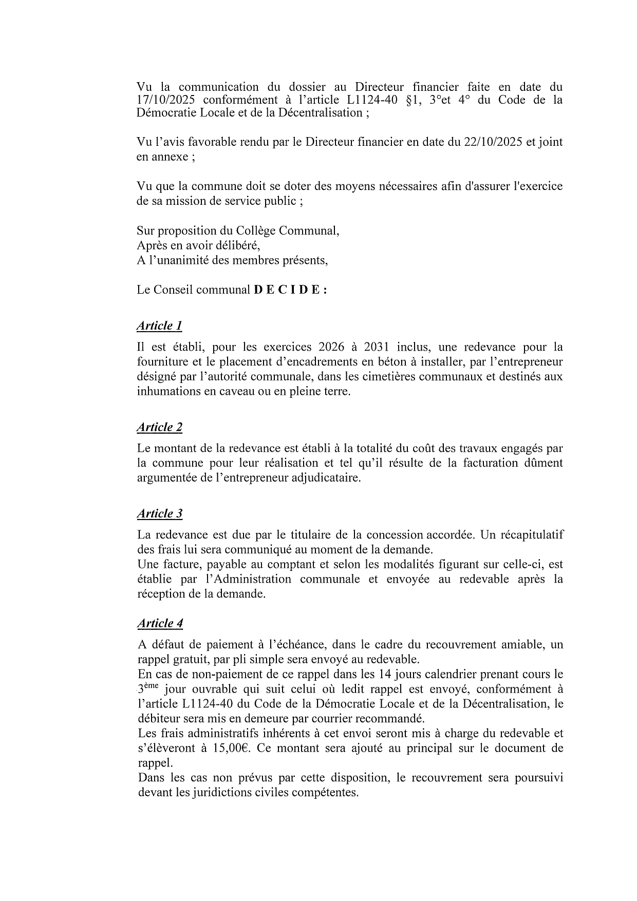 Il est établi, pour les exercices 2020 à 2025, une redevance pour la fourniture et le placement d’encadrements en béton à installer par la Commune dans les cimetières communaux et destinés aux inhumations en pleine terre ;
