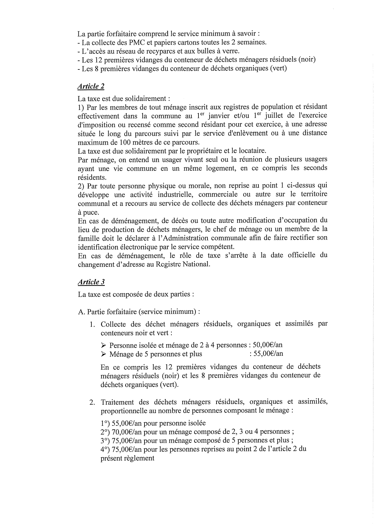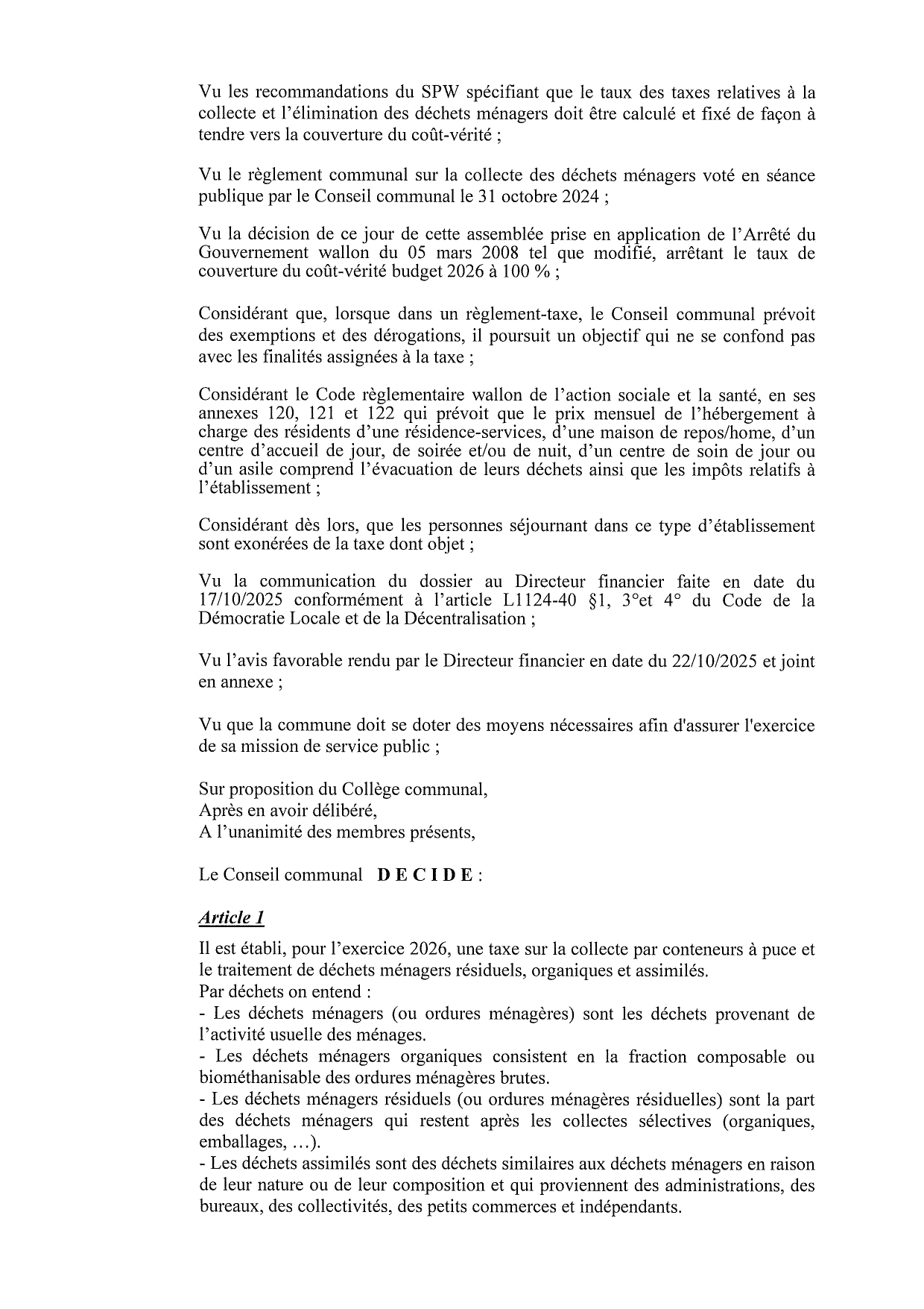 Il est établi, pour l’exercice 2025, une taxe communale sur la collecte des déchets ménagers et des déchets organiques par conteneurs muni d’une puce électronique d’identification.