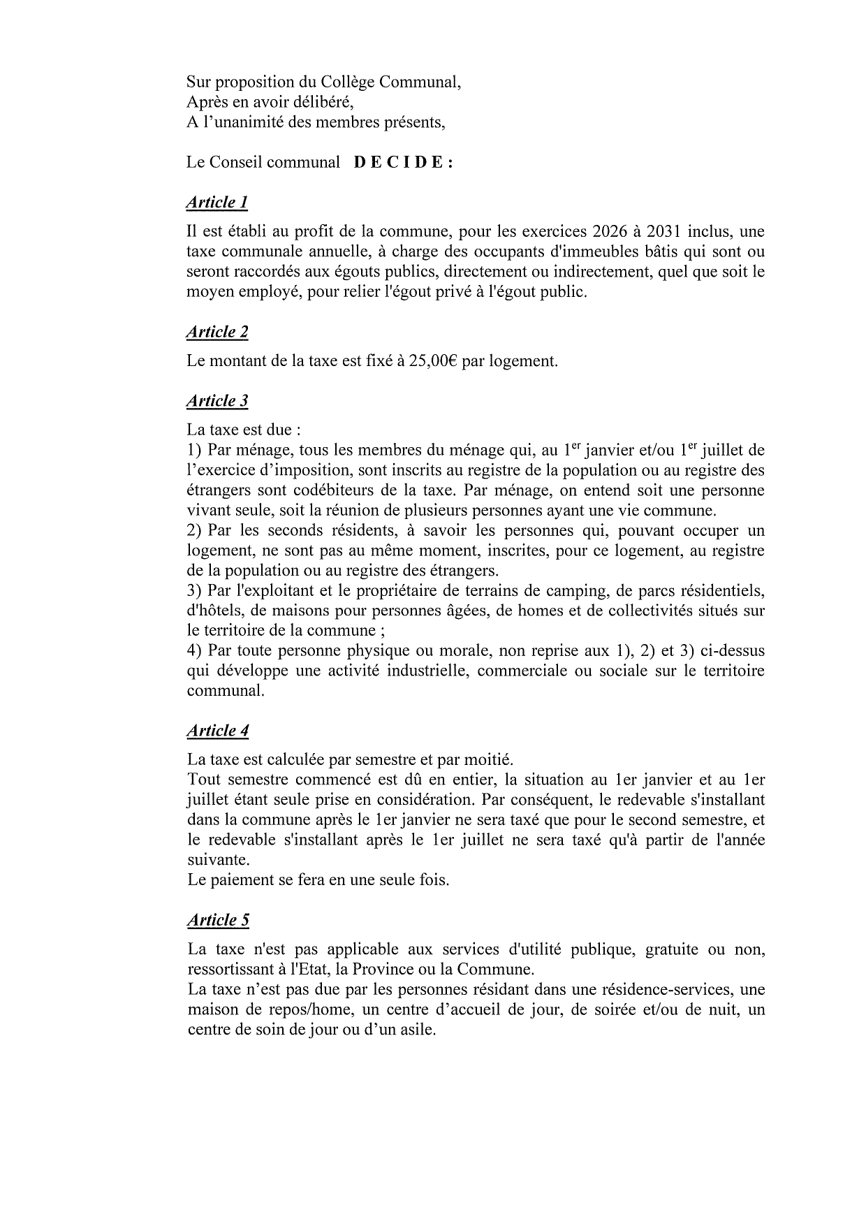 Pour les années 2020 à 2025, il est du solidairement une taxe annuelle de 25 € à charge des occupants d'immeubles bâtis qui sont ou seront raccordés aux égouts publics, directement ou indirectement, quel que soit le moyen employé, le cas échéant, pour relier l'égout privé à l'égout public.