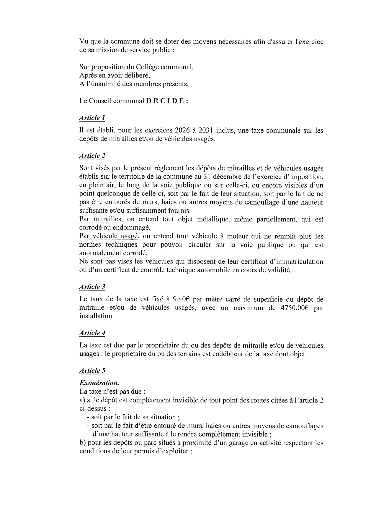 Le règlement fixant la taxe sur les dépôts de mitrailles et/ou de véhicules usagés - exercices 2020 à 2025, voté en séance publique lors du Conseil communal du 24 octobre 2019, est annulé et remplacé par le règlement ci-après :