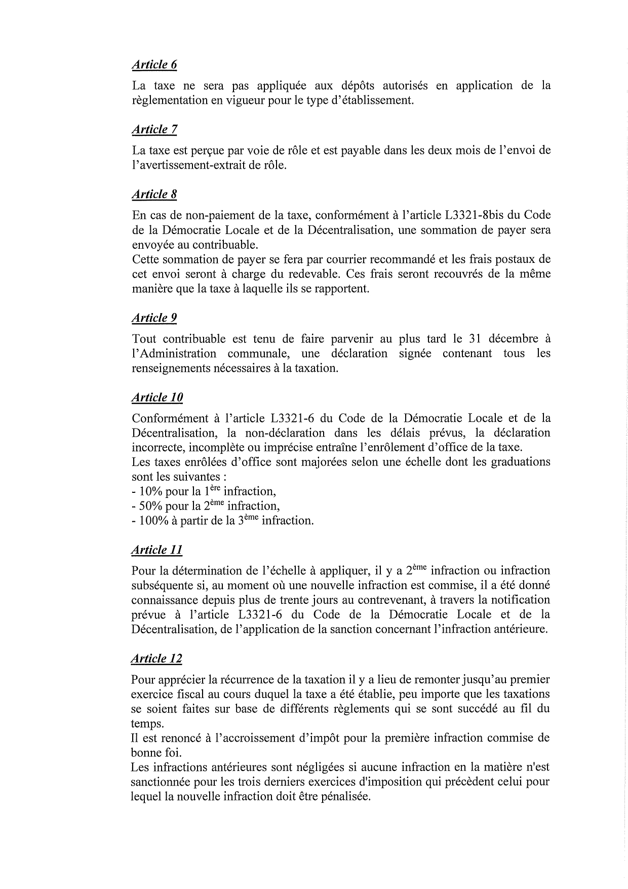 Conformément à l’article L3321-6 du Code de la Démocratie Locale et de la Décentralisation, la non-déclaration dans les délais prévus, la déclaration incorrecte, incomplète ou imprécise entraîne l’enrôlement d’office de la taxe.