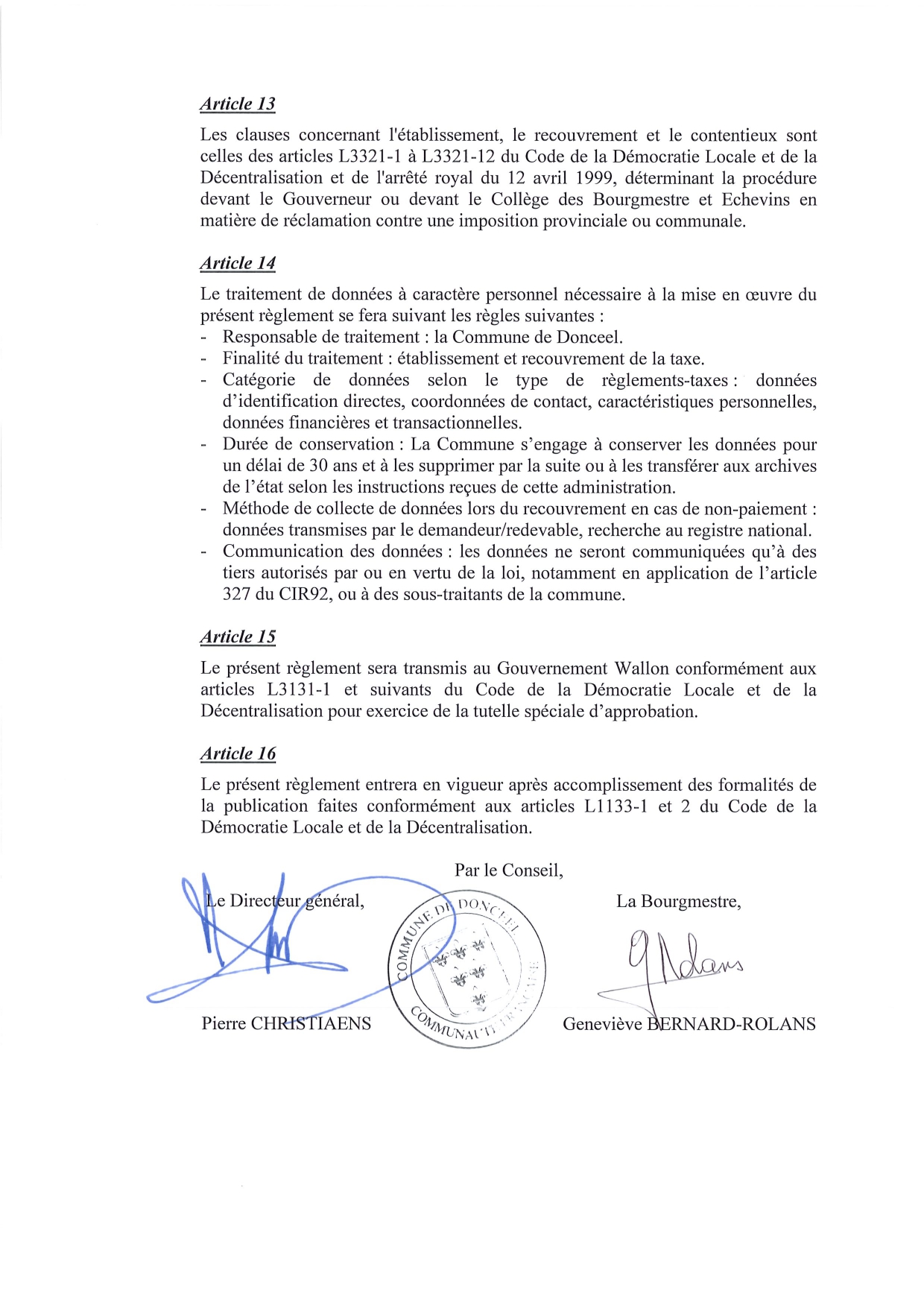 Le présent règlement sera transmis au Gouvernement Wallon conformément aux articles L3131-1 et suivants du Code de la Démocratie Locale et de la Décentralisation pour exercice de la tutelle spéciale d’approbation.